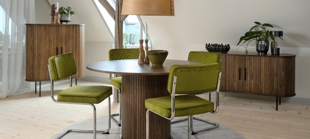 Le rétro glam signe un grand retour en 2026, mais dans une version plus sophistiquée et moins ostentatoire. On retrouve des références aux années 50 à 70 à travers des lignes courbes, des fauteuils enveloppants, des finitions brillantes et des matières nobles comme le velours ou le laiton. Ce style apporte une touche théâtrale maîtrisée, idéale pour structurer un salon.