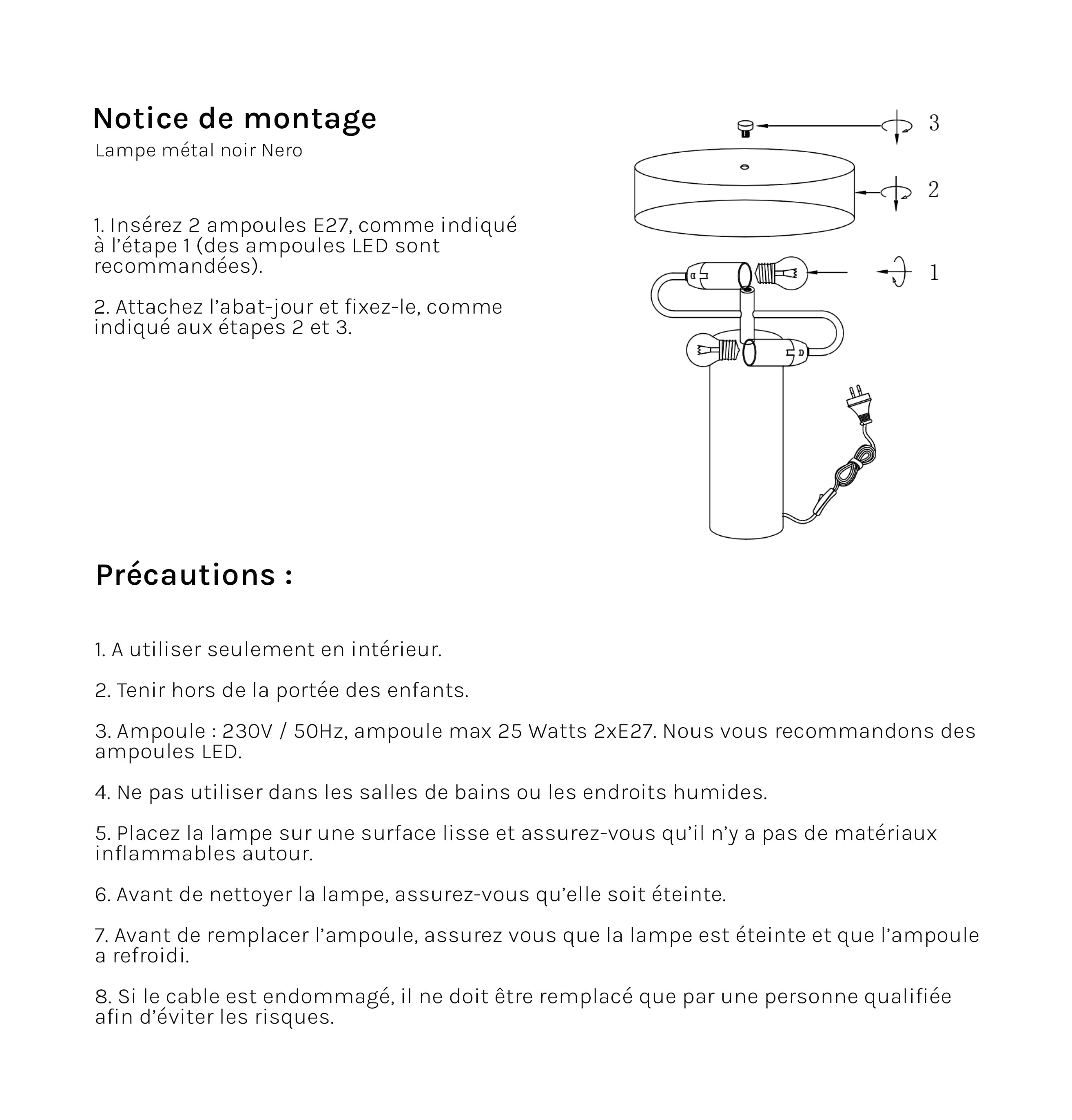 Décoration | Entretien | Nettoyer avec un chiffon microfibre. Ne pas utiliser de produits abrasifs. Ampoule : 2XG9 - MAX. 25W. Non inclus. |